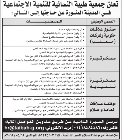 جريدة الوسيلة السعودية. وظائف في شركة بمدينة جدة. وظائف مدارس الحياة المضيئة العالمية بالعليا. مطلوب طبيبة عامة للعمل في الرياض. مطلوب حلاقي...