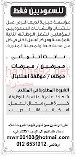 مطلوب لباحث اجتماعي - ممرضين - موظف استقبال .